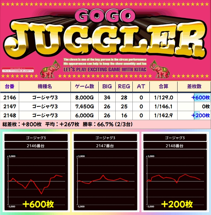 【3台並び】ゴージャグ3(2146番台〜2148番台)→平均+267枚(2/3台+)