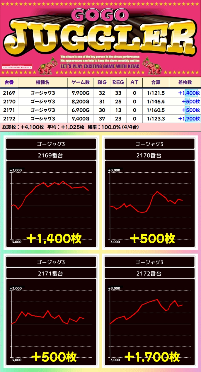 【4台並び】ゴージャグ3(2169番台〜2172番台)→平均+1,025枚(4/4台+)