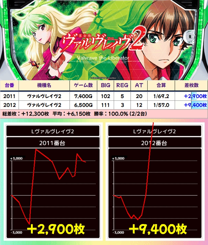 【2台並び】ヴァルヴレイヴ2(2011番台〜2012番台)→平均+6,150枚(2/2台+)