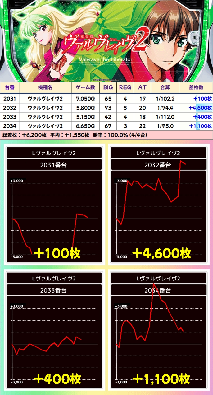 【4台並び】ヴァルヴレイヴ2(2031番台〜2034番台)→平均+1,550枚(4/4台+)
