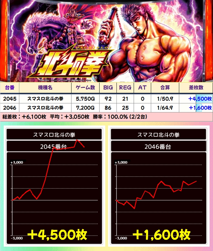 【2台並び】スマスロ北斗の拳(2045番台〜2046番台)→平均+3,050枚(2/2台+)