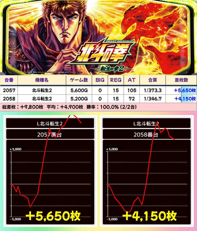 【2台並び】北斗転生2(2057番台〜2058番台)→平均+4,900枚(2/2台+)