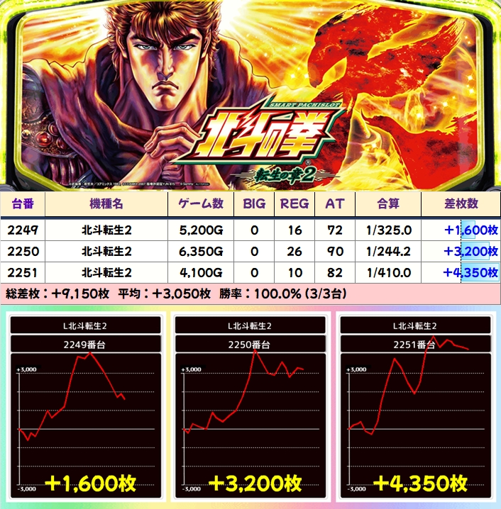 【3台並び】北斗転生2(2249番台〜2251番台)→平均+3,050枚(3/3台+)