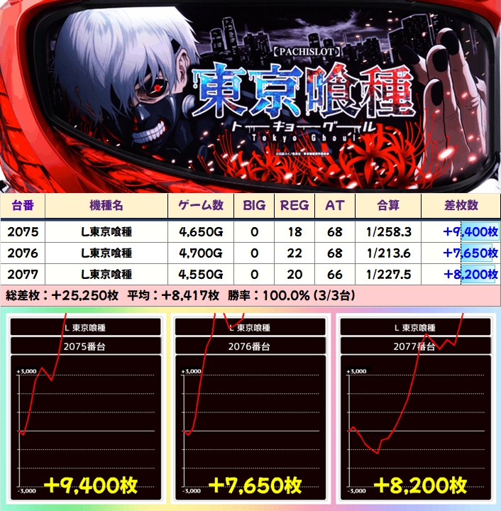 【3台並び】L東京喰種(2075番台〜2077番台)→平均+8,417枚(3/3台+)