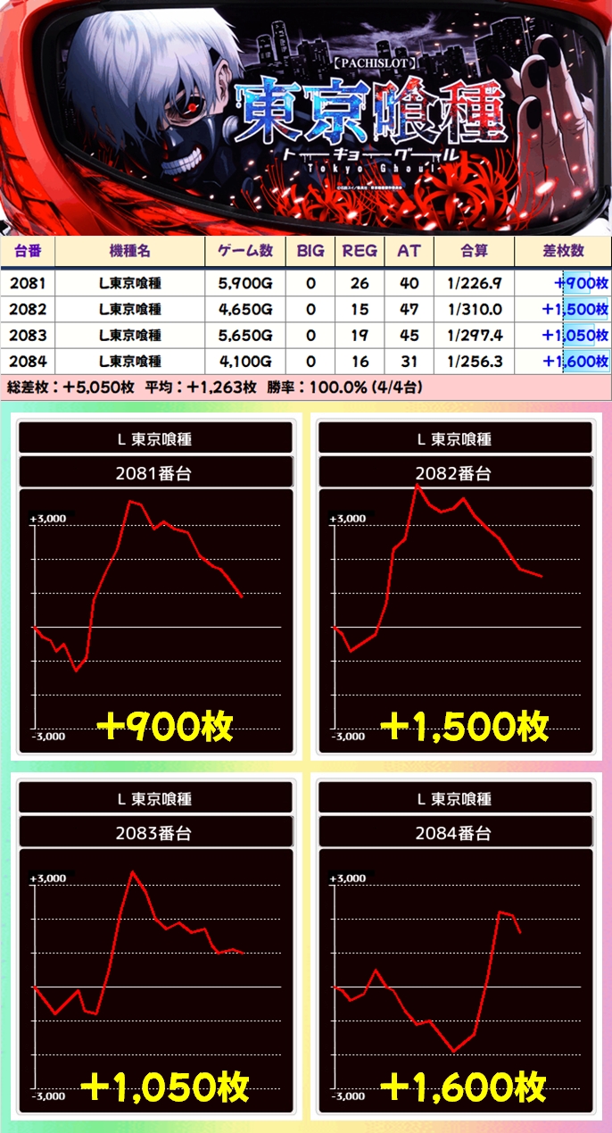 【4台並び】L東京喰種(2081番台〜2084番台)→平均+1,263枚(4/4台+)