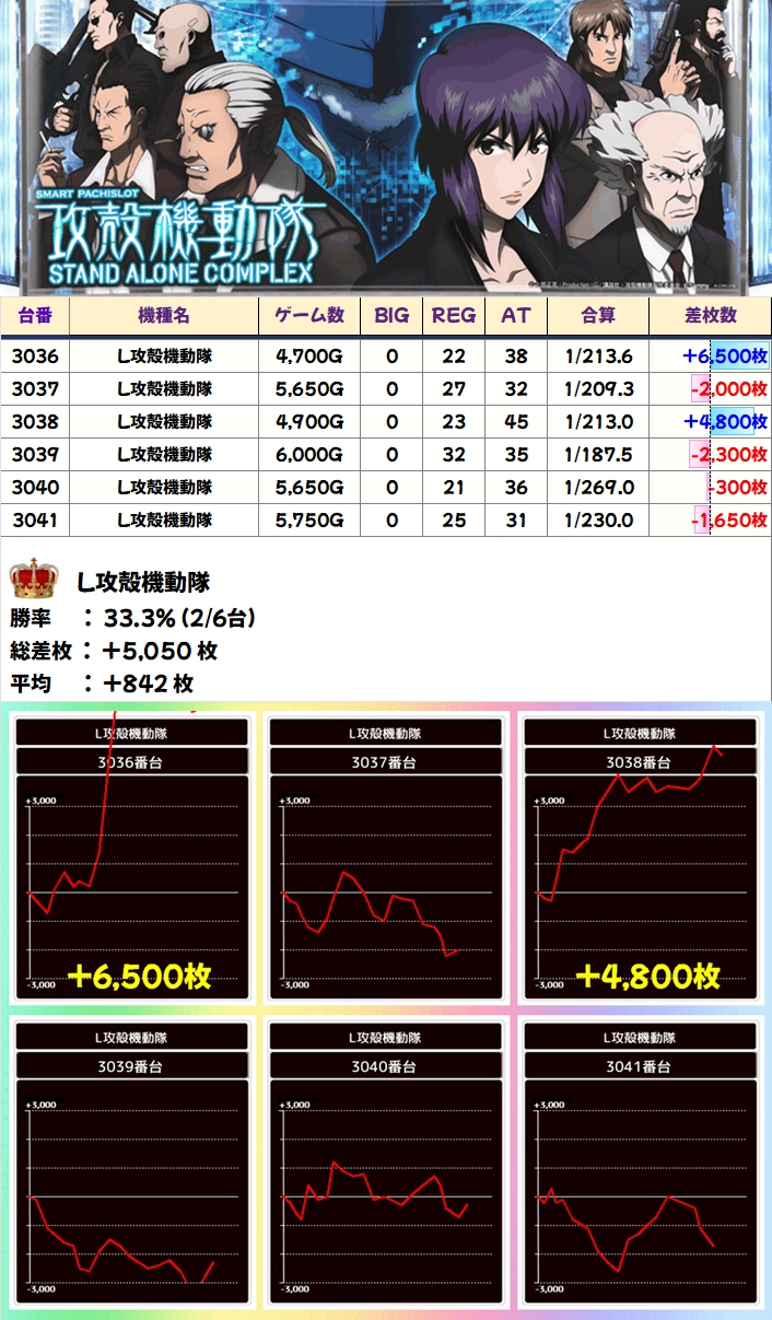 なお、攻殻機動隊に関しては不発台が目立つ結果になっていますが、6台とも夜までしっかり稼働しているところを見ると、打たれていた方は示唆演出や挙動から仕掛けの対象だと判断された可能性が高そうです。