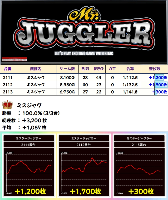 【1/2系濃厚】ミスジャグ(3/3台+)→平均+1,067枚