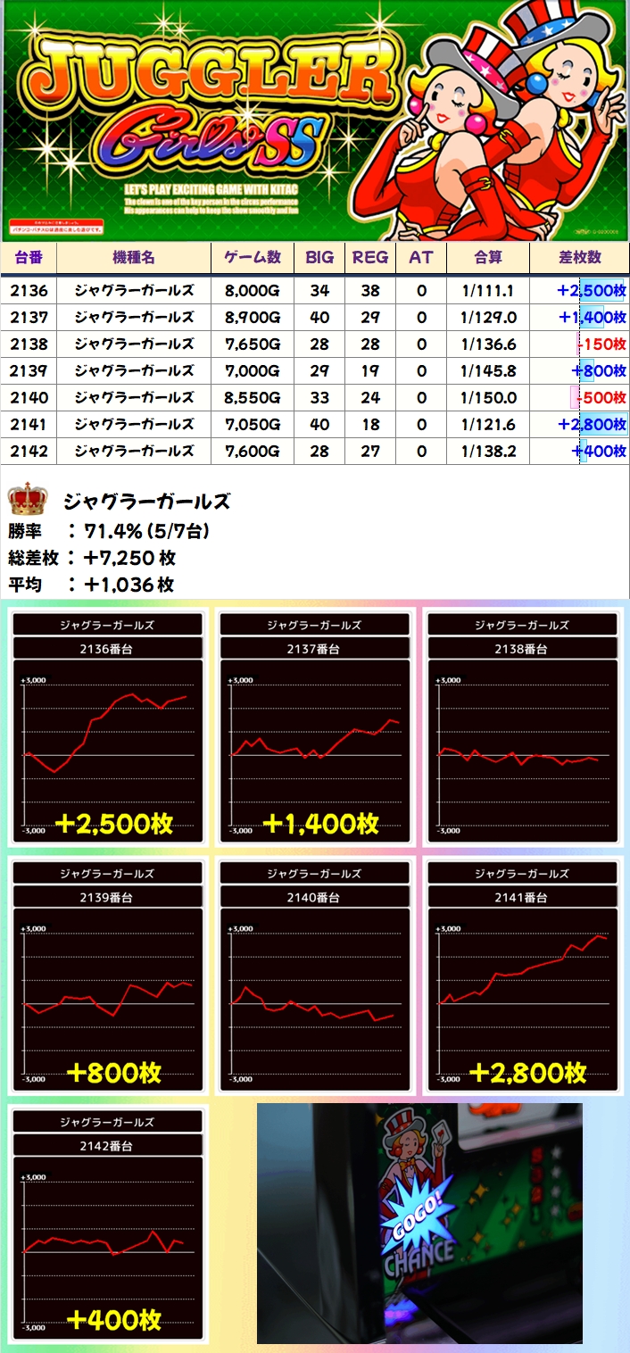 【1/2系濃厚】ジャグラーガールズ(5/7台+)→平均+1,036枚