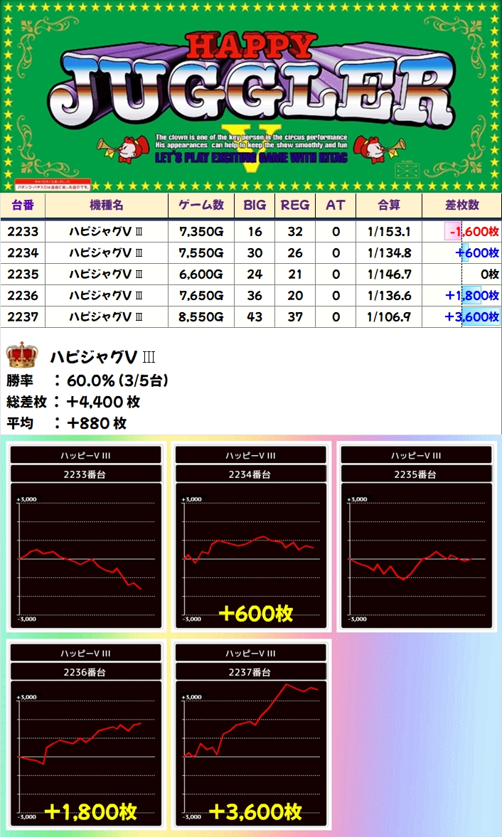 【1/2系濃厚】ハピジャグV Ⅲ(3/5台+)→平均+880枚