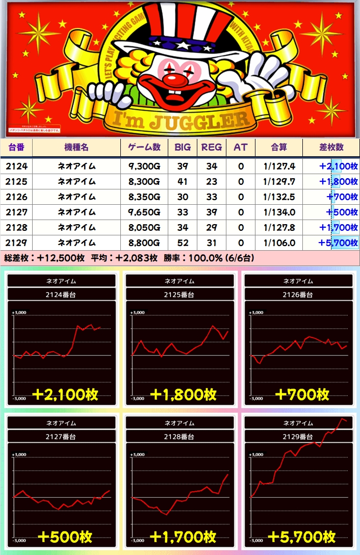 【6台並び】ネオアイムジャグラーEX(2124番台〜2129番台)→平均+2,083枚(6/6台+)