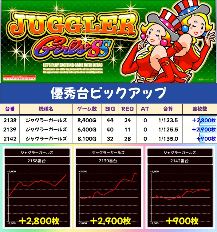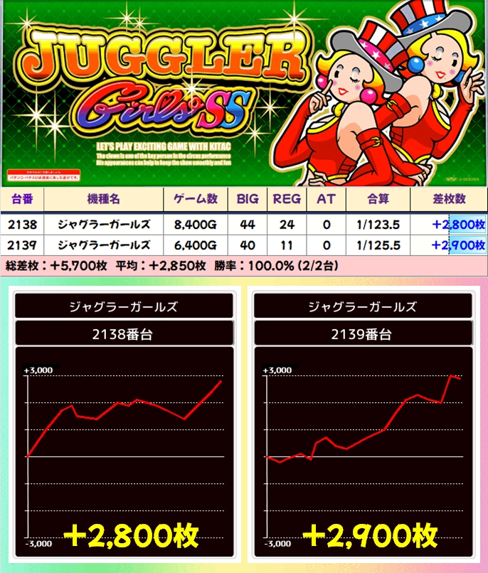 【2台並び】ジャグラーガールズ(2138番台〜2139番台)→平均+2,850枚(2/2台+)
