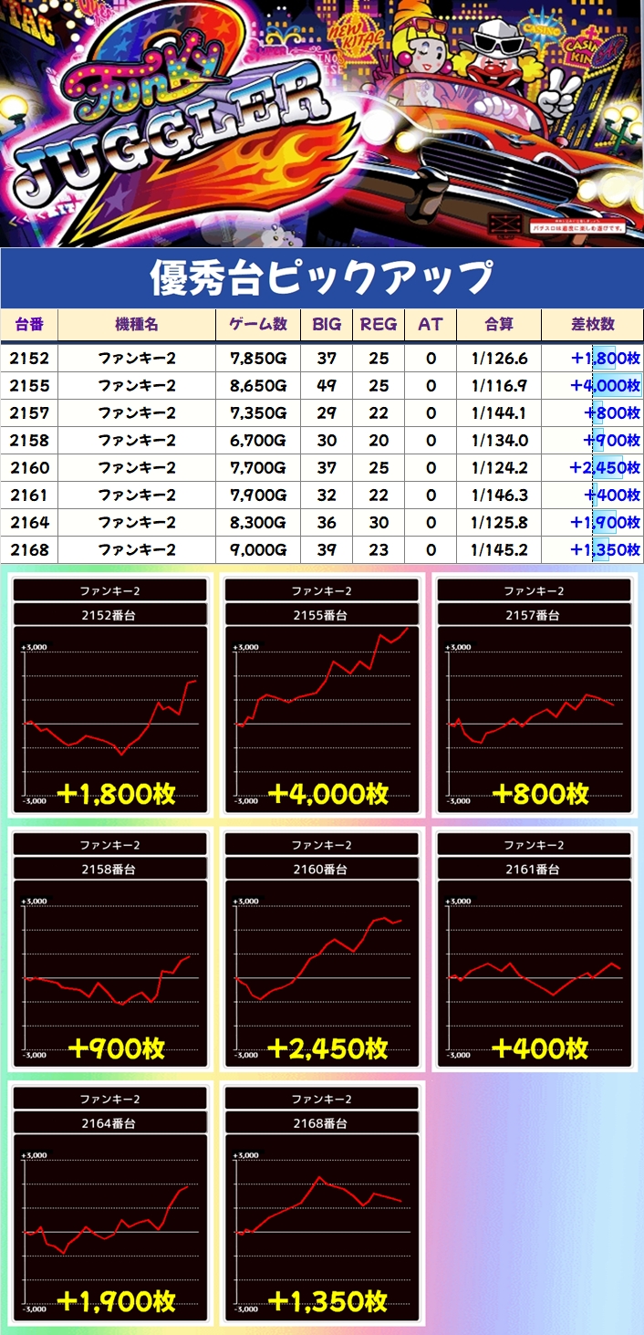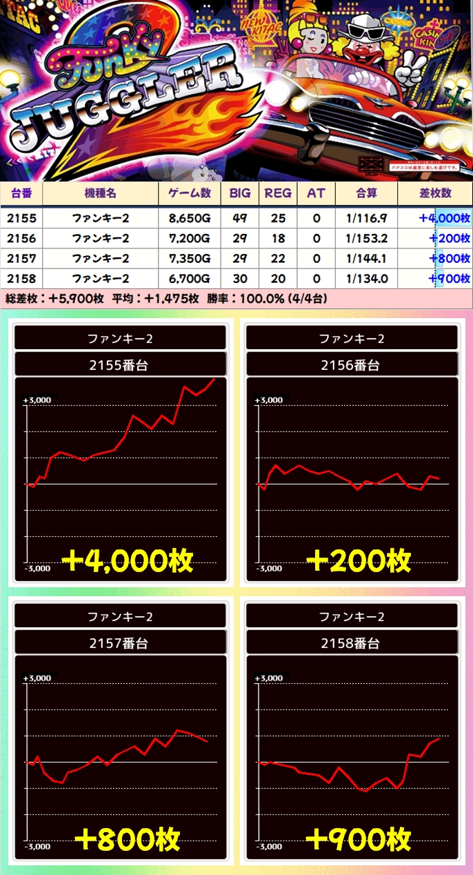 【4台並び】ファンキージャグラー2(2155番台〜2158番台)→平均+1,475枚(4/4台+)