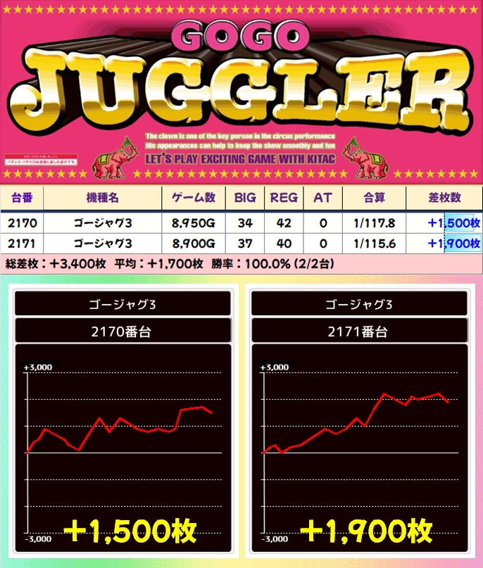 【2台並び】ゴーゴージャグラー3(2170番台〜2171番台)→平均+1,700枚(2/2台+)