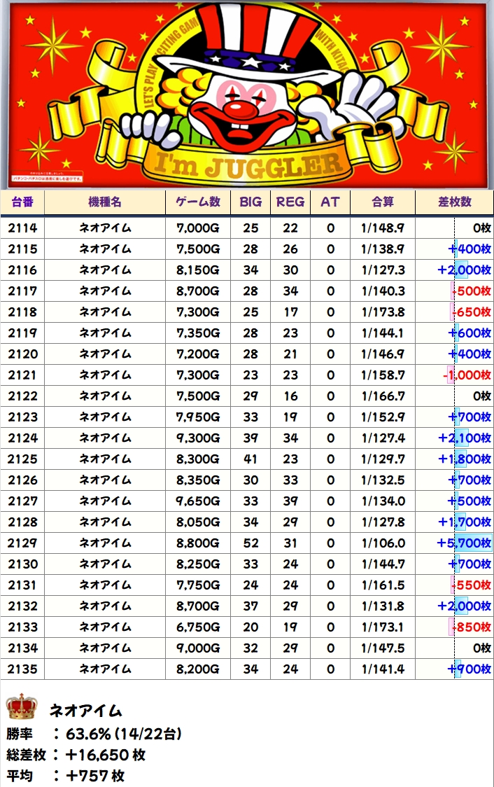 【1/2系濃厚】ネオアイム(14/22台+)→平均+757枚