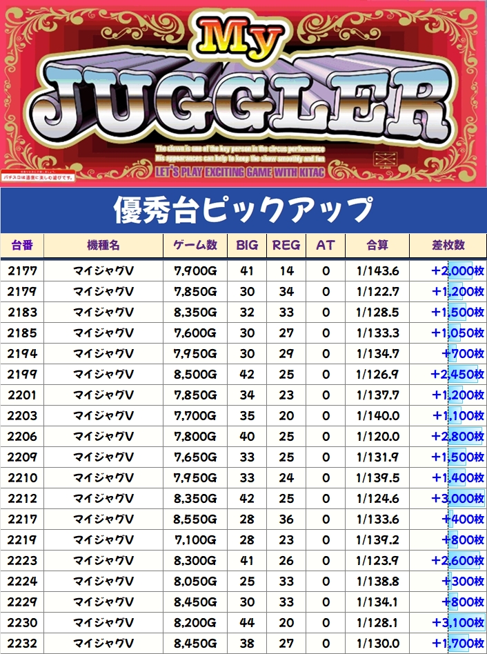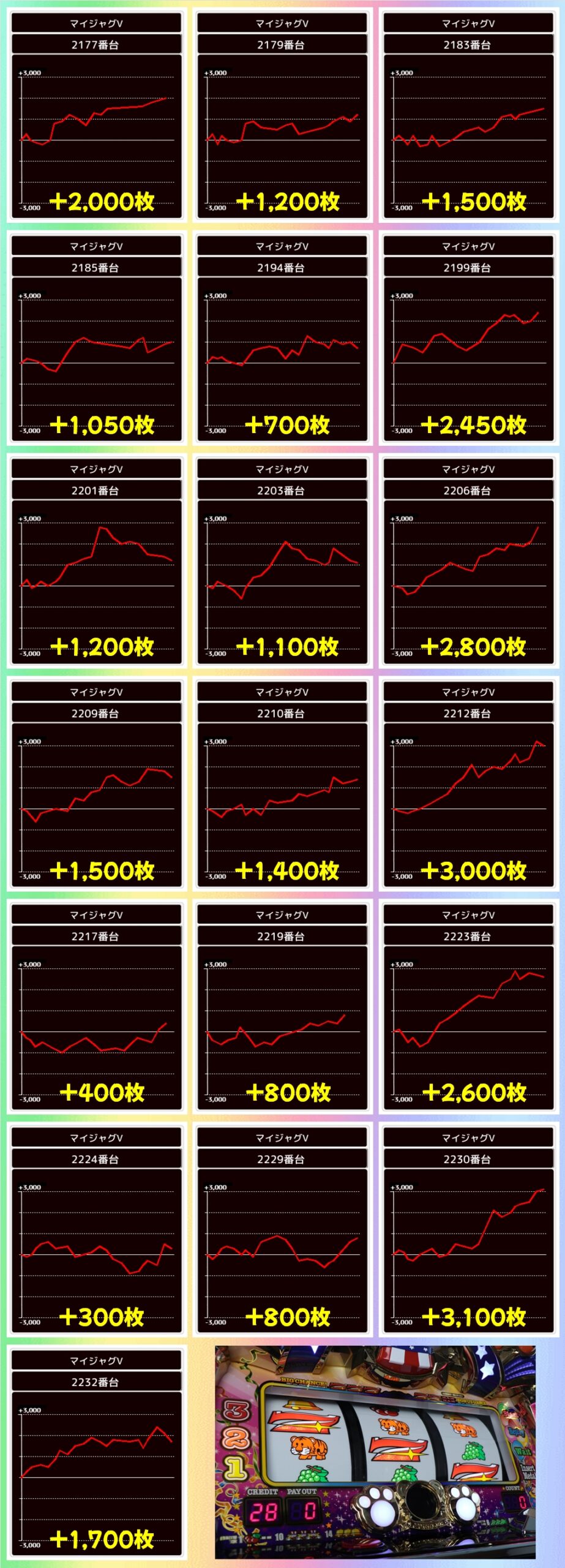 【2台並び】マイジャグラーⅤ(2209番台〜2210番台)→平均+1,450枚(2/2台+)