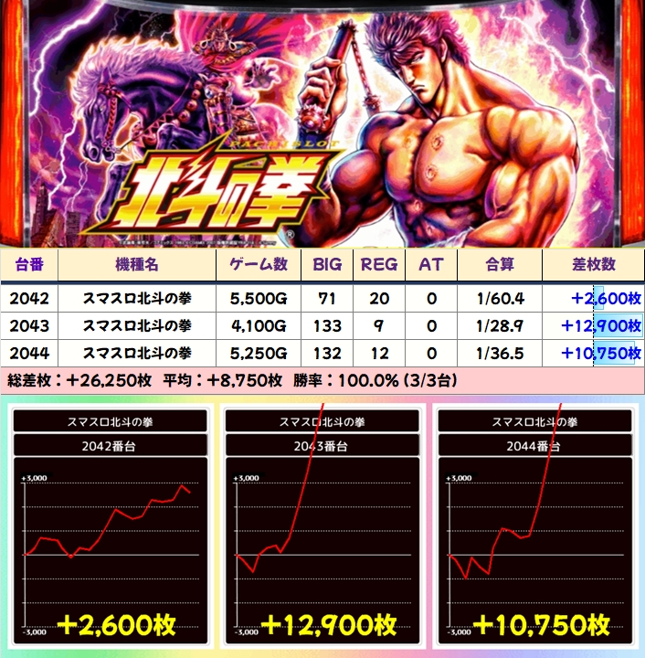 【3台並び】スマスロ北斗の拳(2042番台〜2044番台)→平均+8,750枚(3/3台+)