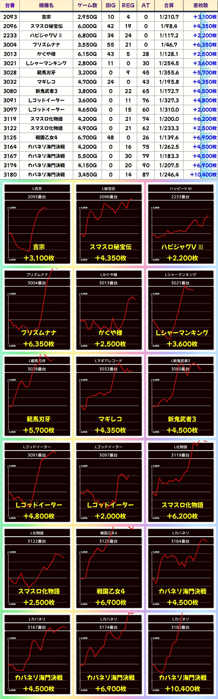 これだけの機種が仕掛けの対象になっていれば、朝の抽選で遅番だったとしてもツモるチャンスは十分ありそうですね。