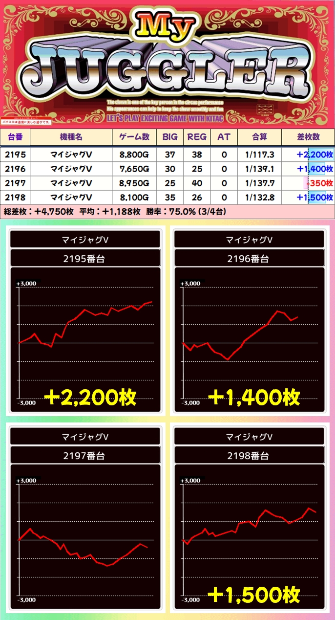 【4台並び】マイジャグV(2195台番〜2198台番)→平均+1,188枚(3/4台+)