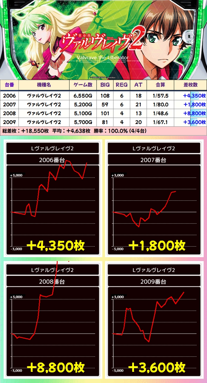 【4台並び】ヴァルヴレイヴ2(2006台番〜2009台番)→平均+4,638枚(4/4台+)