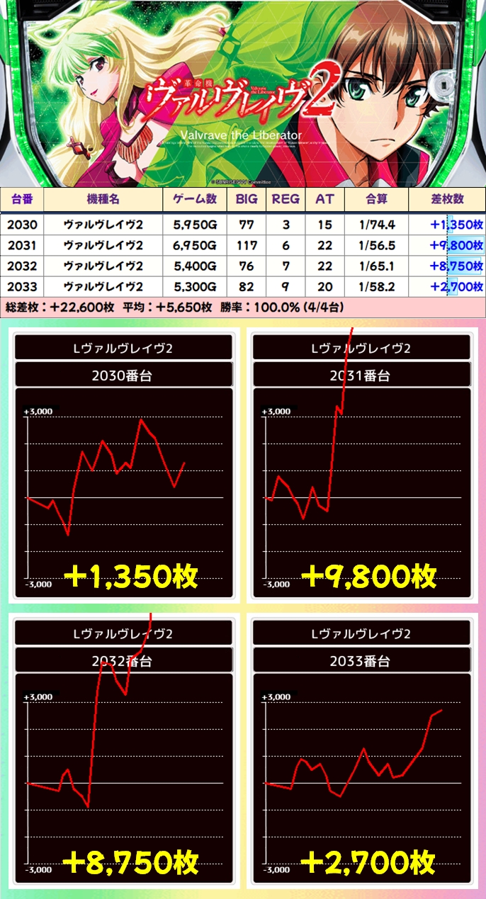 【4台並び】ヴァルヴレイヴ2(2030台番〜2033台番)→平均+5,650枚(4/4台+)