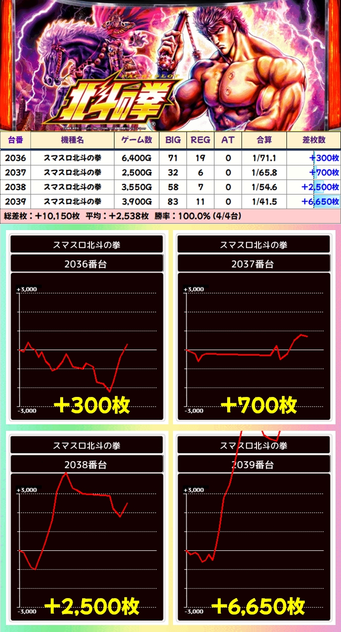 【4台並び】スマスロ北斗の拳(2036台番〜2039台番)→平均+2,538枚(4/4台+)