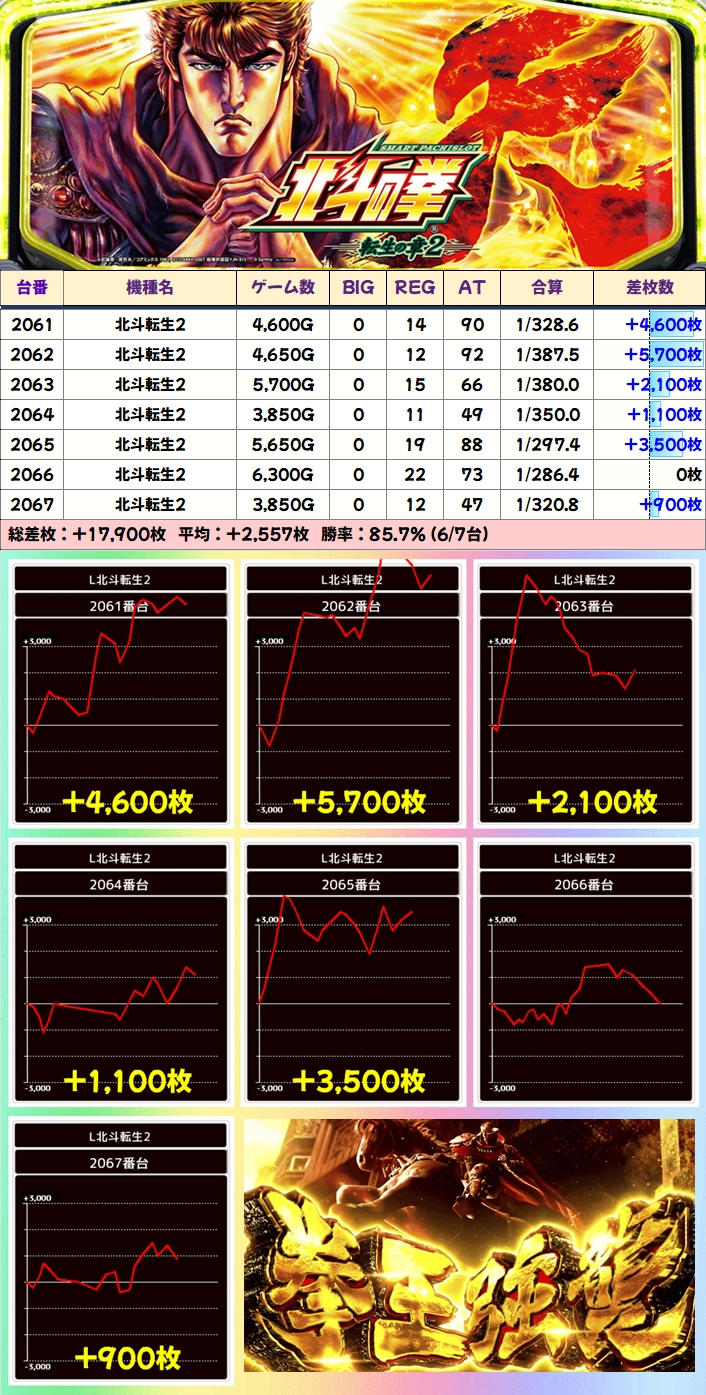 【7台並び】北斗転生2(2061台番〜2067台番)→平均+2,557枚(6/7台+)