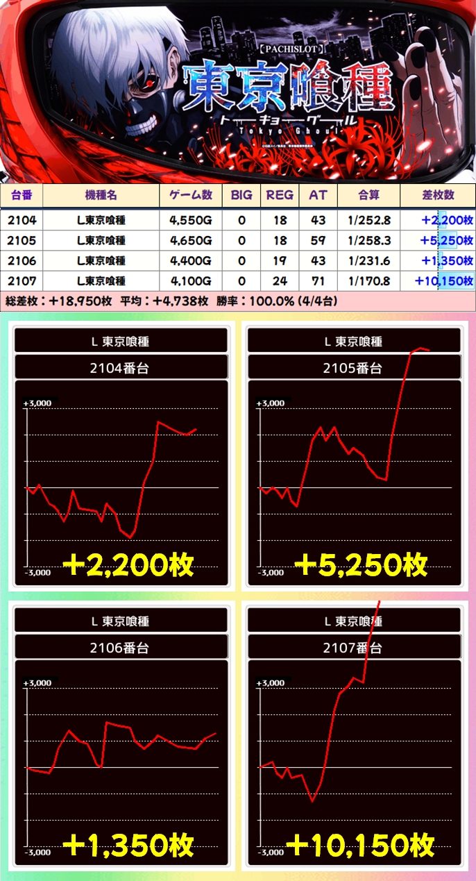【4台並び】L東京喰種(2104台番〜2107台番)→平均+4,738枚(4/4台+)