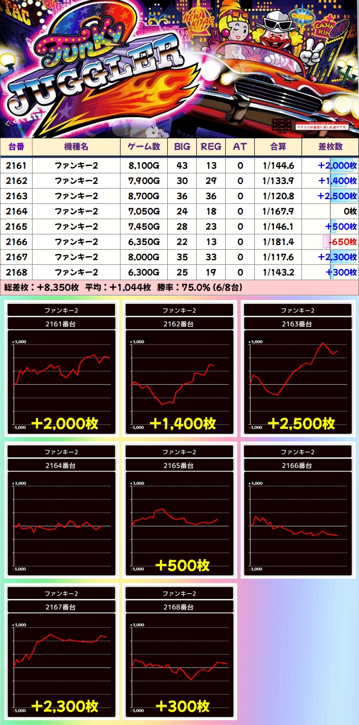 【8台並び】ファンキー2(2161台番〜2168台番)→平均+1,044枚(6/8台+)