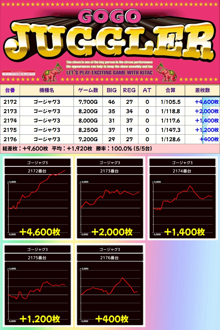 【5台並び】ゴージャグ3(2172台番〜2176台番)→平均+1,920枚(5/5台+)