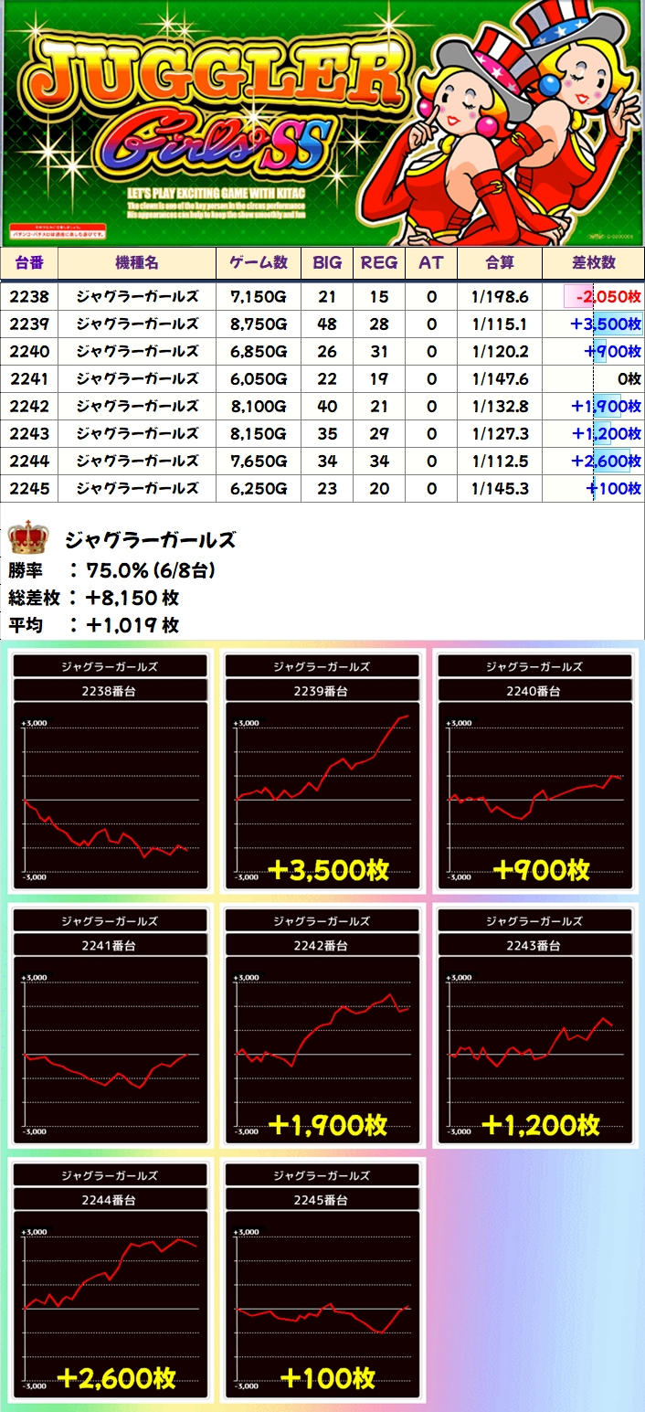 【3台並び】ジャグラーガールズ(2242台番〜2244台番)→平均+1,900枚(3/3台+)