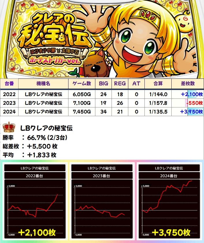 LBクレアの秘宝伝(2/3台+)→平均+1,833枚