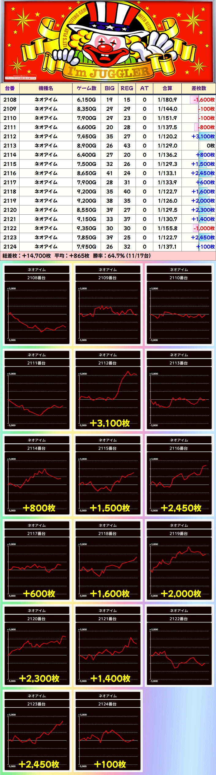 【列仕掛け】ネオアイム(2108台番〜2124台番)→平均+865枚(11/17台+)