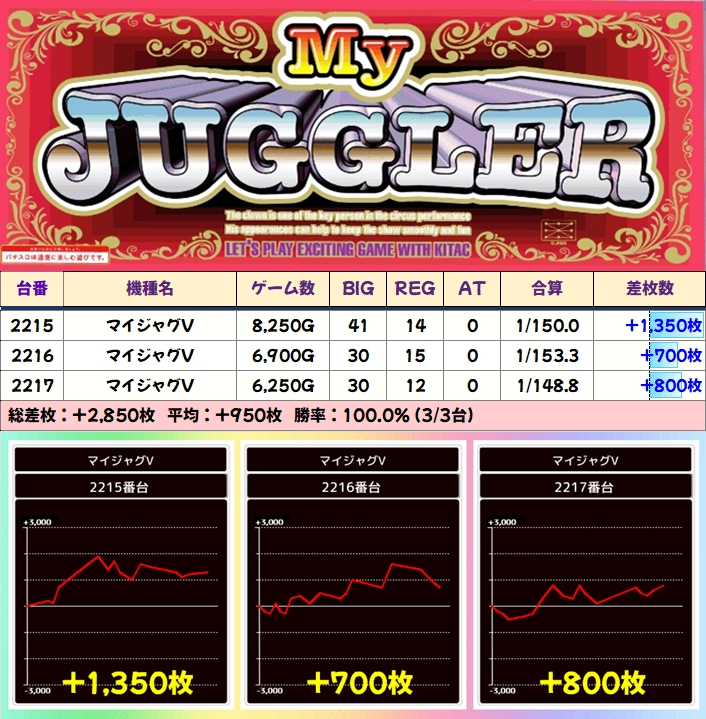 【3台並び】マイジャグラーV(2215台番〜2217台番)→平均+950枚(3/3台+)