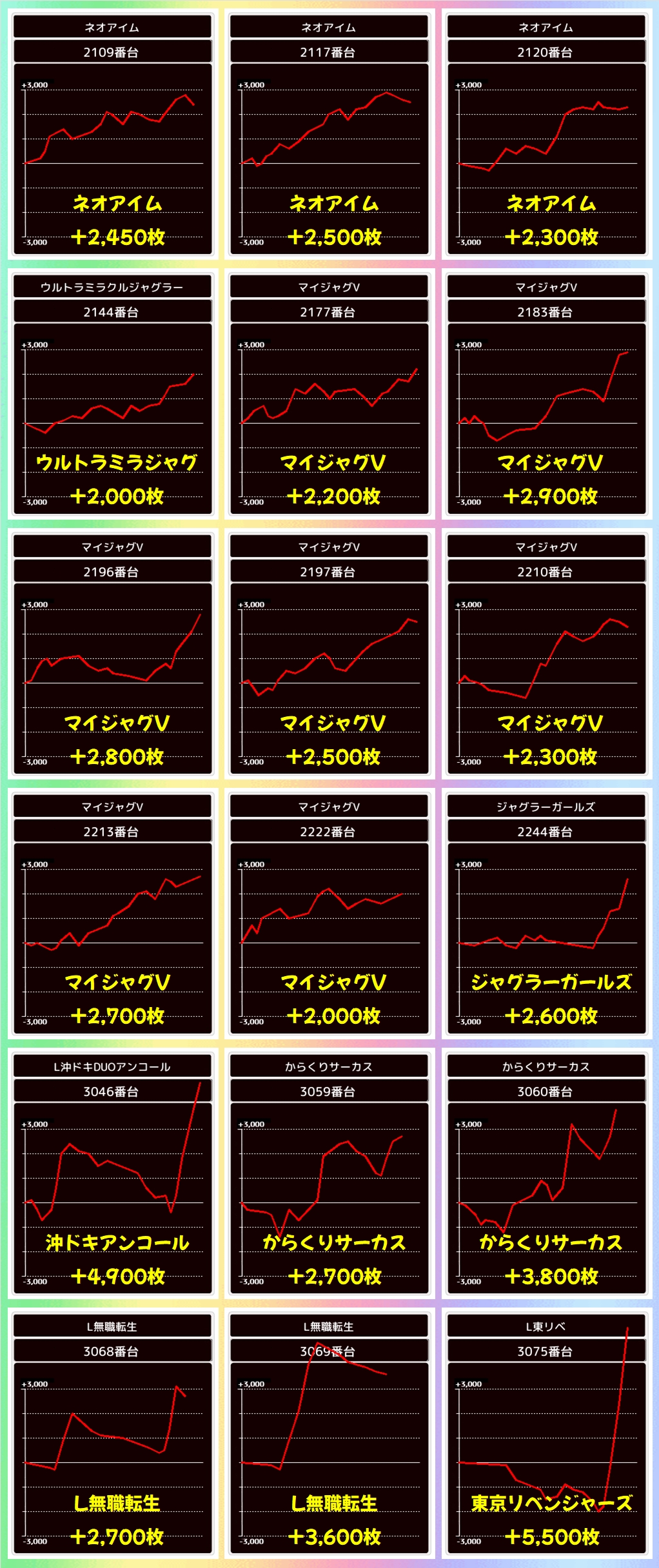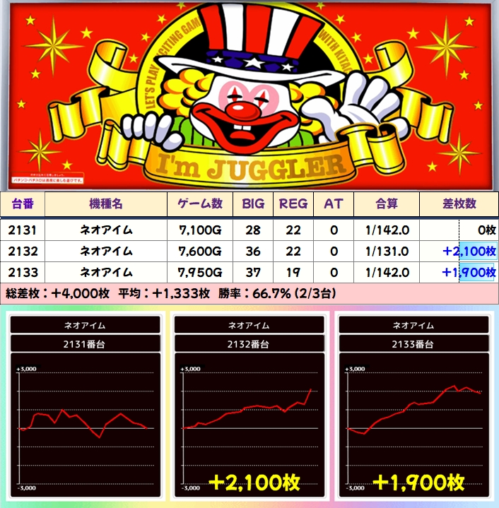【3台並び】ネオアイム(2131台番〜2133台番)→平均+1,333枚(2/3台+)