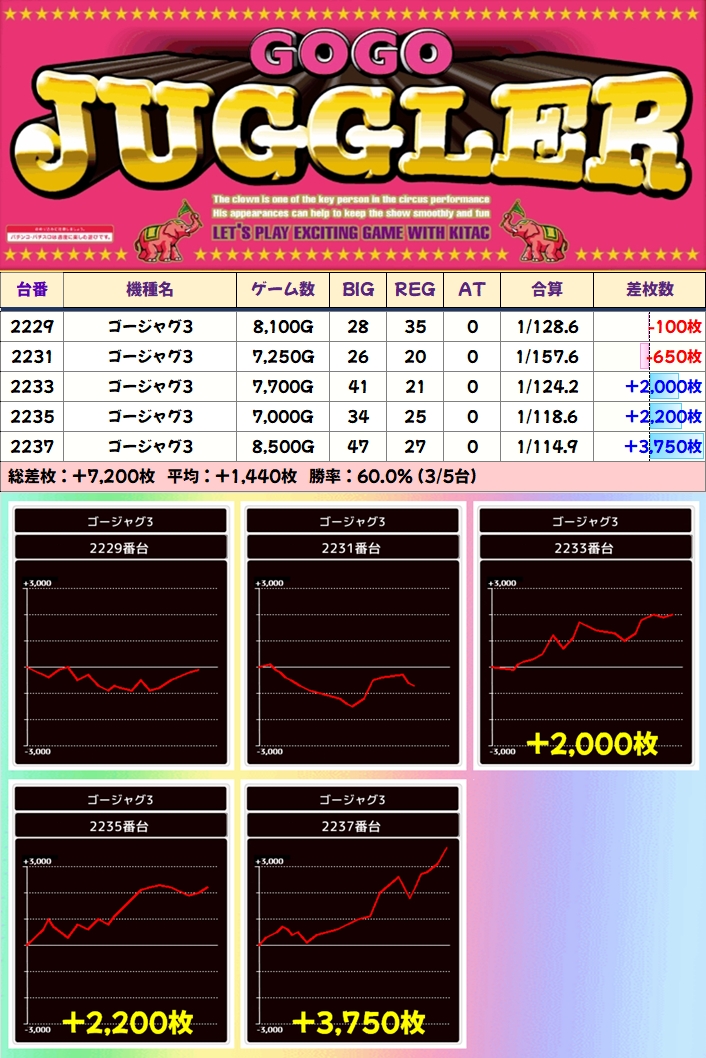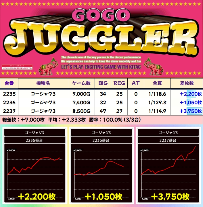 【3台並び】ゴーゴージャグラー3(2235台番〜2237台番)→平均+2,333枚(3/3台+)