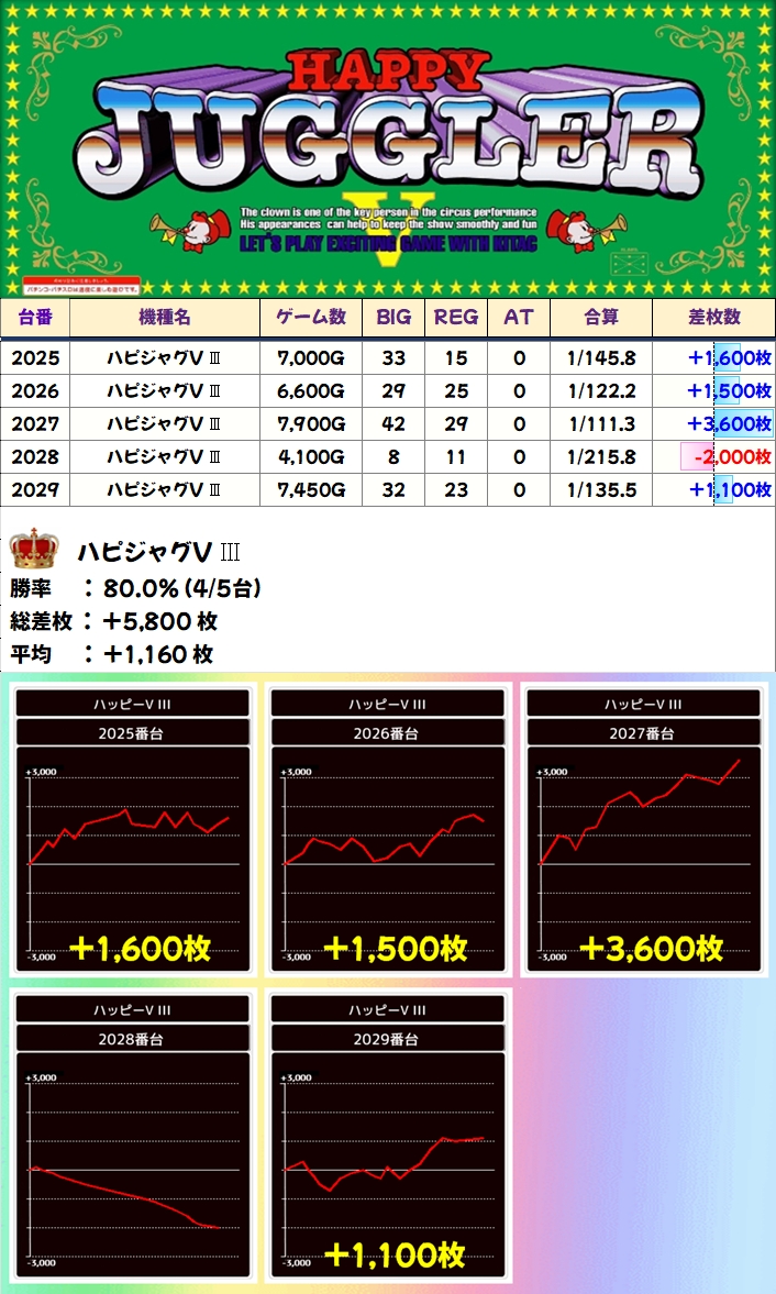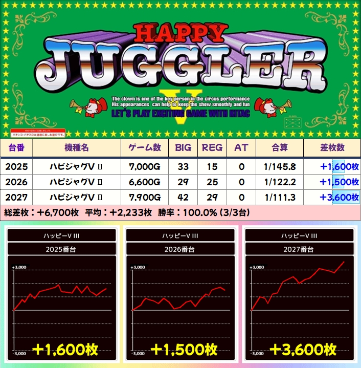 【3台並び】ハッピージャグラーVⅢ(2025台番〜2027台番)→平均+2,233枚(3/3台+)