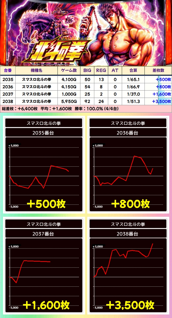 【4台並び】スマスロ北斗の拳(2035台番〜2038台番)→平均+1,600枚(4/4台+)