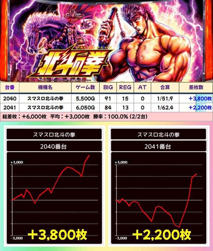 【2台並び】スマスロ北斗の拳(2040台番〜2041台番)→平均+3,000枚(2/2台+)