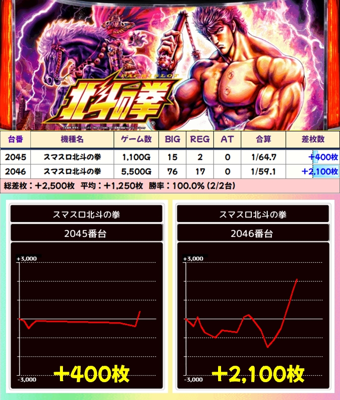 【2台並び】スマスロ北斗の拳(2045台番〜2046台番)→平均+1,250枚(2/2台+)