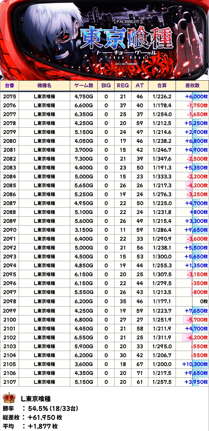 【1/2系濃厚】L東京喰種(18/33台+)→平均+1,877枚