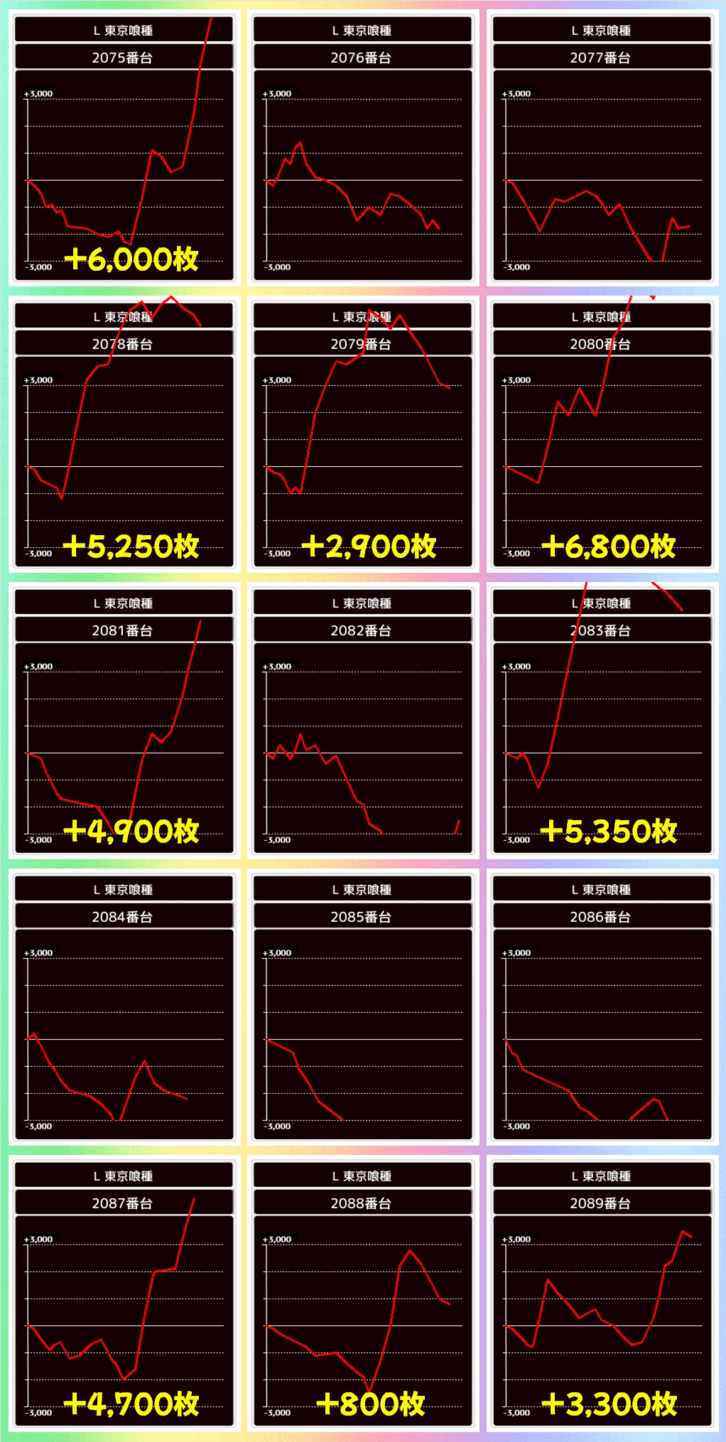 【2台並び】L東京喰種(2080台番〜2081台番)→平均+5,850枚(2/2台+)