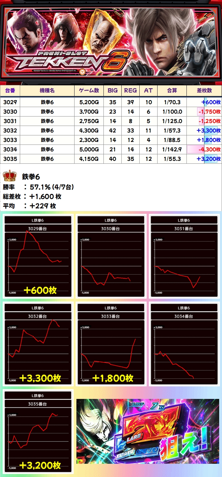 【高配分】鉄拳6(4/7台+)→平均+229枚