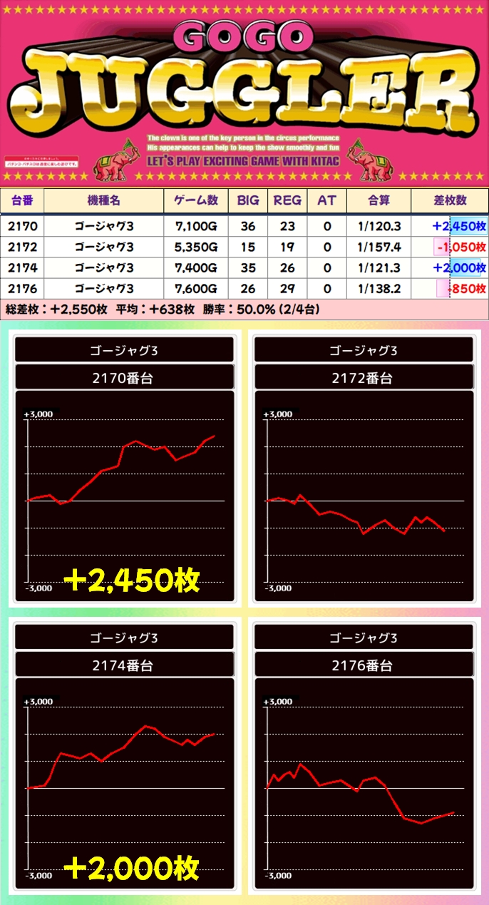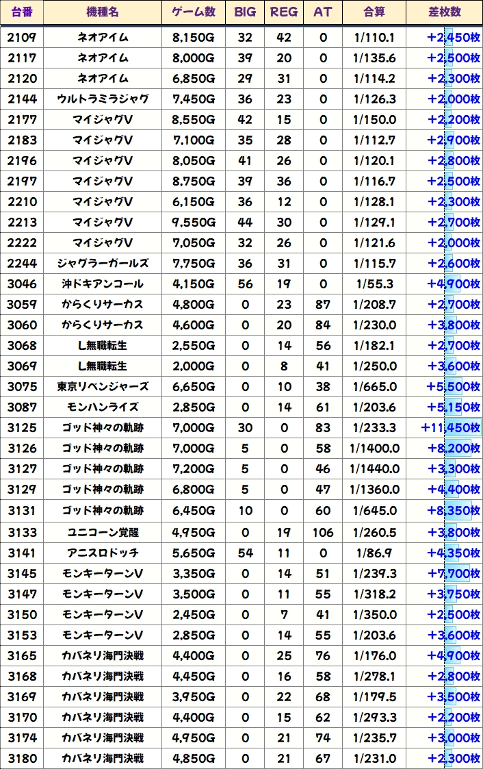 この日はオススメ機種に高配分の仕掛けが多数用意されていたようで、1/2系濃厚の機種も複数確認!