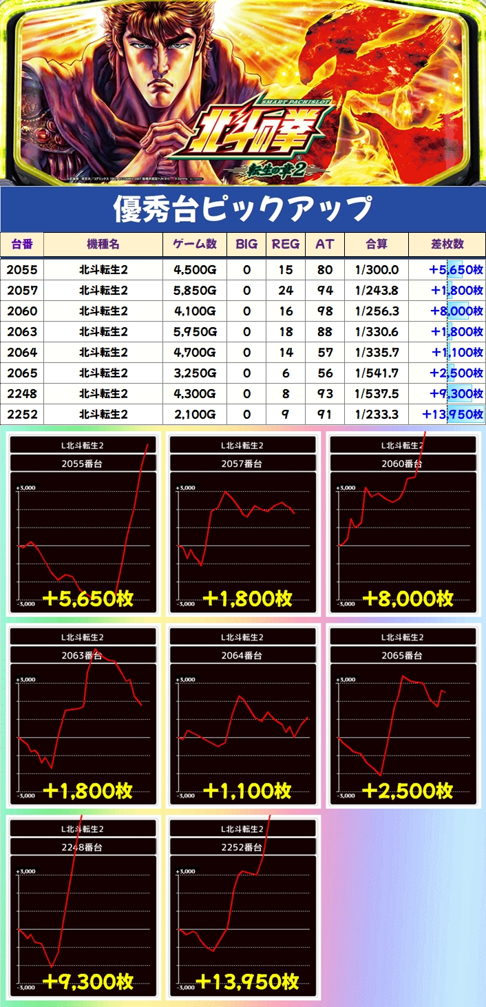 スマスロ北斗と北斗転生2はどちらも週間オススメとなっており、この日も両機種から優秀台が多数出現!