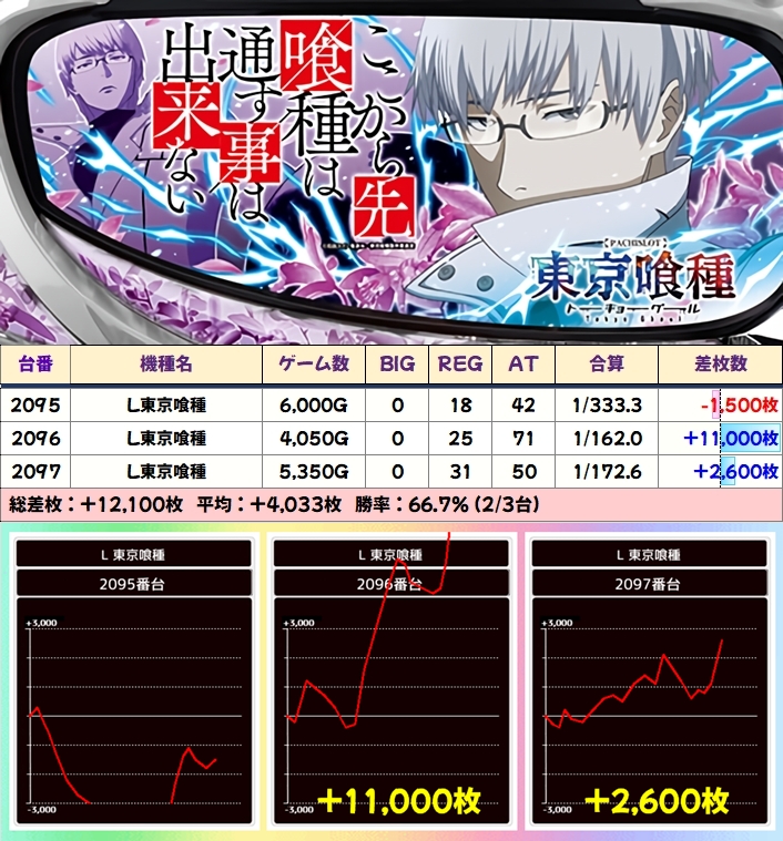 【3台並び】L東京喰種・有馬パネル(2095台番〜2097台番)→平均+4,033枚(2/3台+)