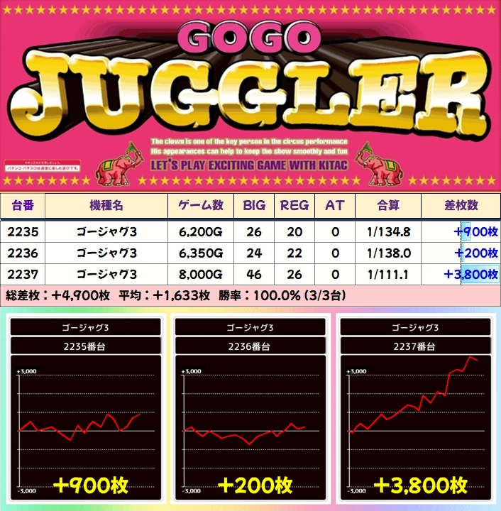 【3台並び】ゴージャグ3(2235台番〜2237台番)→平均+1,633枚(3/3台+)