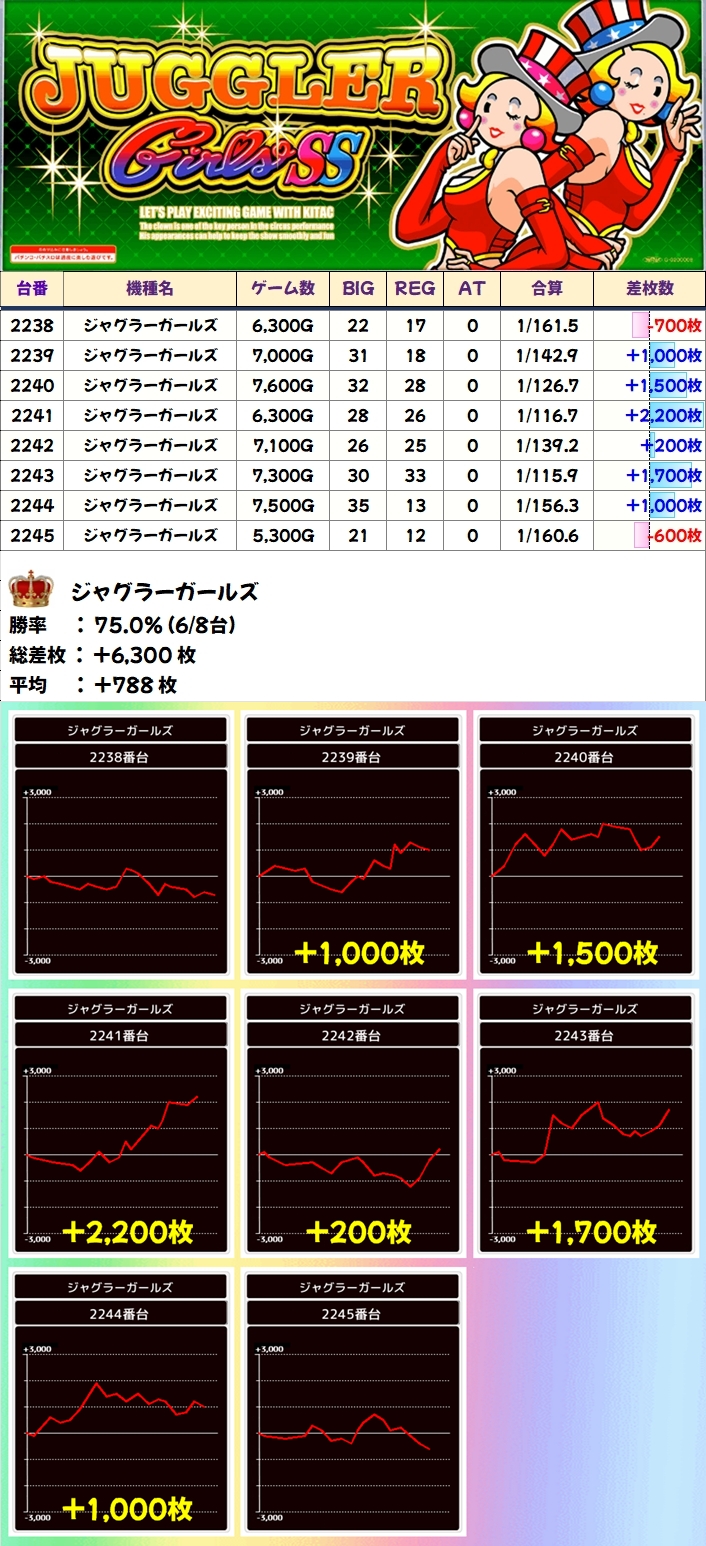 【2台並び】ジャグラーガールズ(2239台番〜2240台番)→平均+1,250枚(2/2台+)