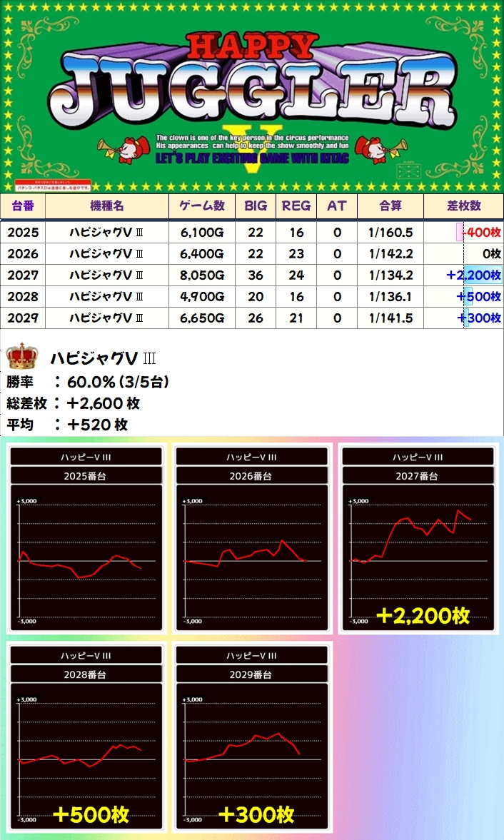 【1/2系濃厚】ハピジャグV Ⅲ(3/5台+)→平均+520枚