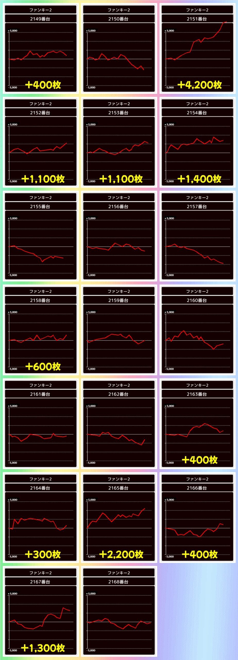 【3台並び】ファンキー2(2151台番〜2153台番)→平均+2,133枚(3/3台+)