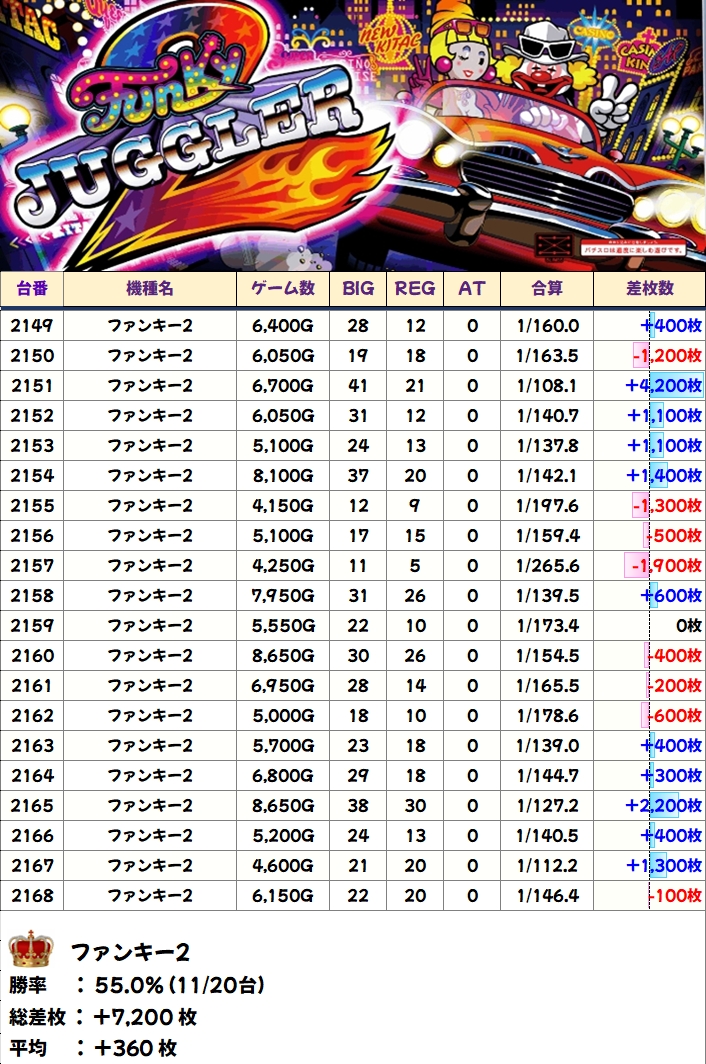 【1/2系濃厚】ファンキー2(11/20台+)→平均+360枚